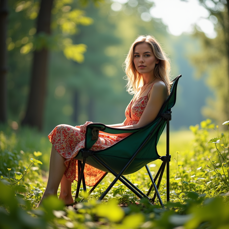 woman sitting in a camping chair, wearing a casual outdoor outfit, surrounded by lush greenery, under a clear blue sky