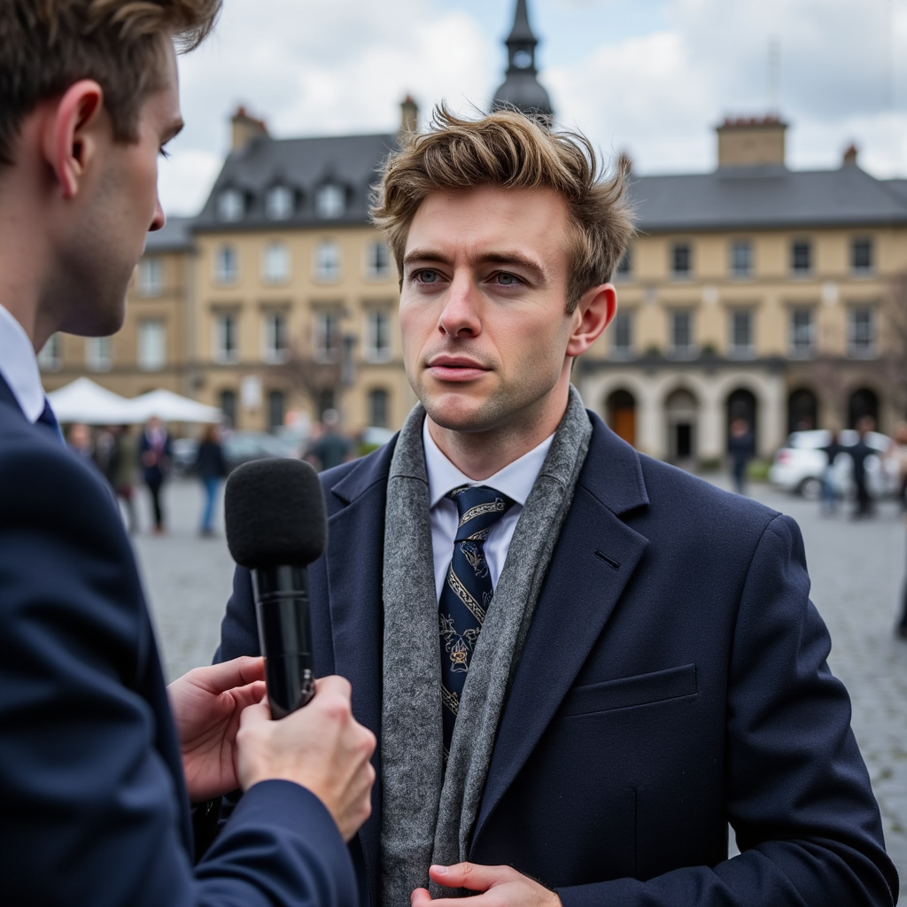 Highly realistic, highly detailed HDR image of a man journalist in a dark wool overcoat over a navy suit, gray scarf draped loosely; short neatly styled hair. Camera: 35mm lens, f/2.8, ISO 200, half-body, shot at slight upward angle outdoors. Lighting: bright overcast sky as giant softbox, natural catchlight in eyes, soft jawline shadow. Pose: holding handheld microphone toward unseen subject, expression focused and…