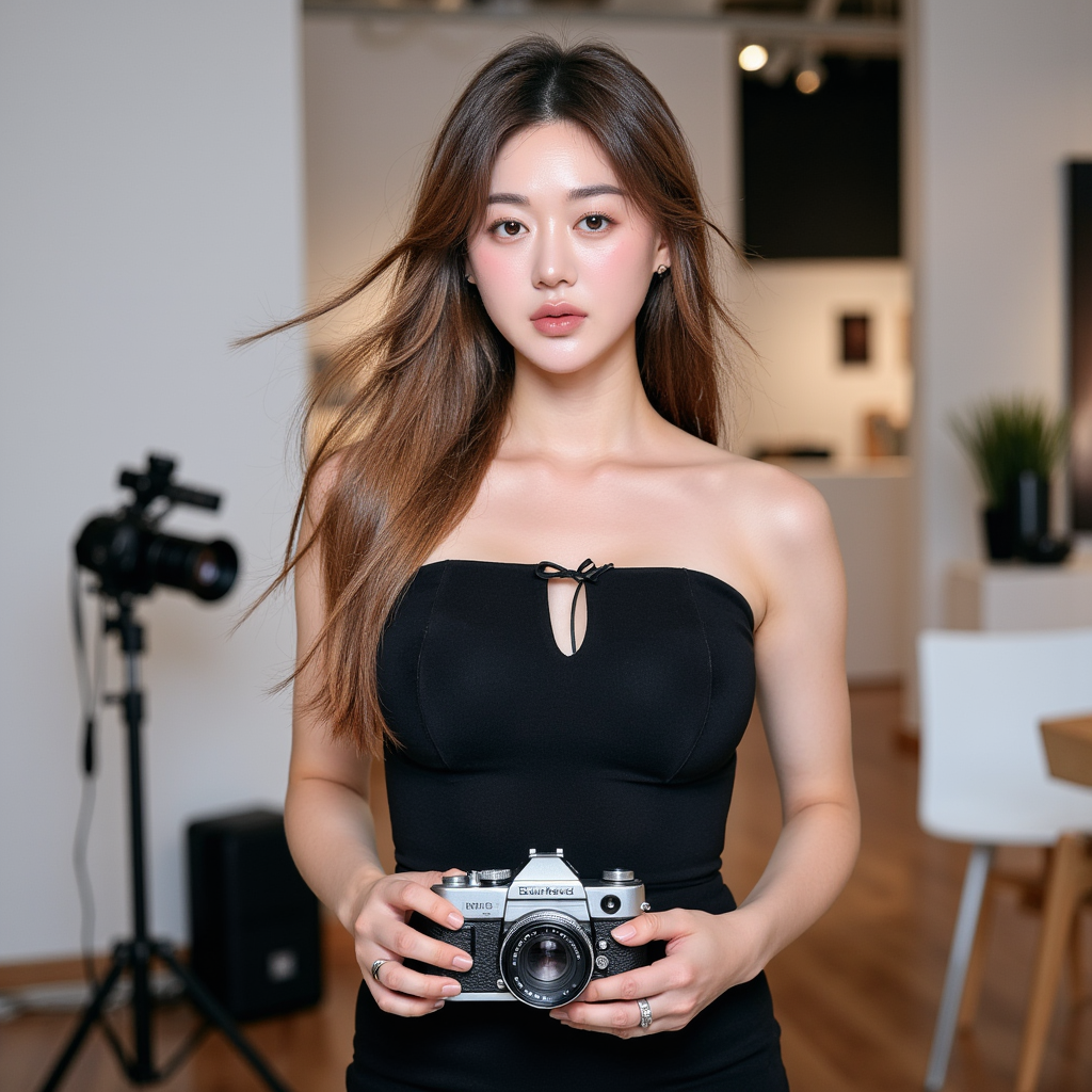 Portrait of a documentary-style photographer holding a camera with both hands, windblown hair, raw natural lighting, capturing the spirit of World Photography Day