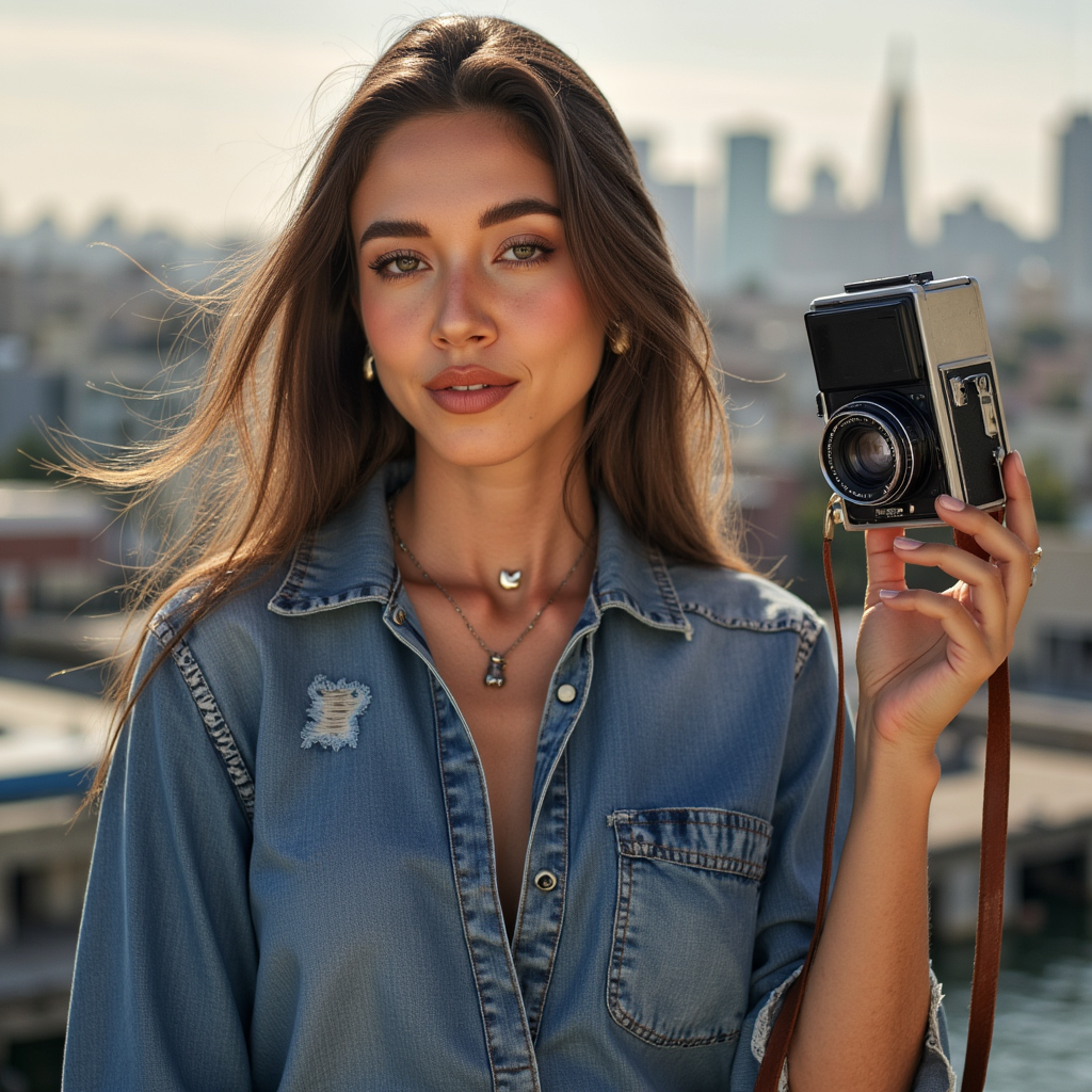 woman wearing a loose-fitting, artistically distressed denim shirt with subtle paint splatters on the sleeves. Her delicate, layered silver necklaces gleam subtly, complementing a pair of small, artisan-crafted stud earrings shaped like miniature aperture blades. She holds a beautifully preserved, antique medium format camera, its leather strap worn smooth, positioned casually in her left hand, a silent homage to her…
