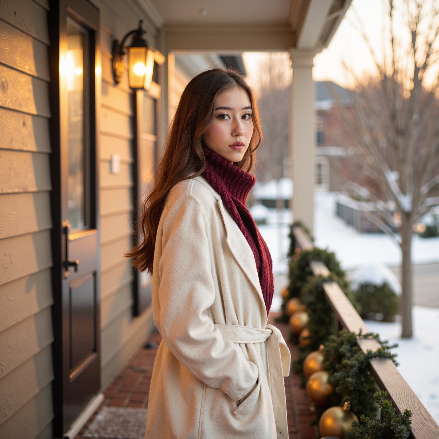 Waist-up portrait of a woman standing on a decorated porch during golden-hour winter light, body angled 25° from the camera, turning gently back toward the lens. She wears a cream wool wrap coat with a soft tie belt and a burgundy knit scarf layered neatly. Hair: loose waves with halo-like warm highlights from sun. Makeup: peach-gold luminous tones, soft coral lip. Lighting: natural golden hour sunlight wraps around…