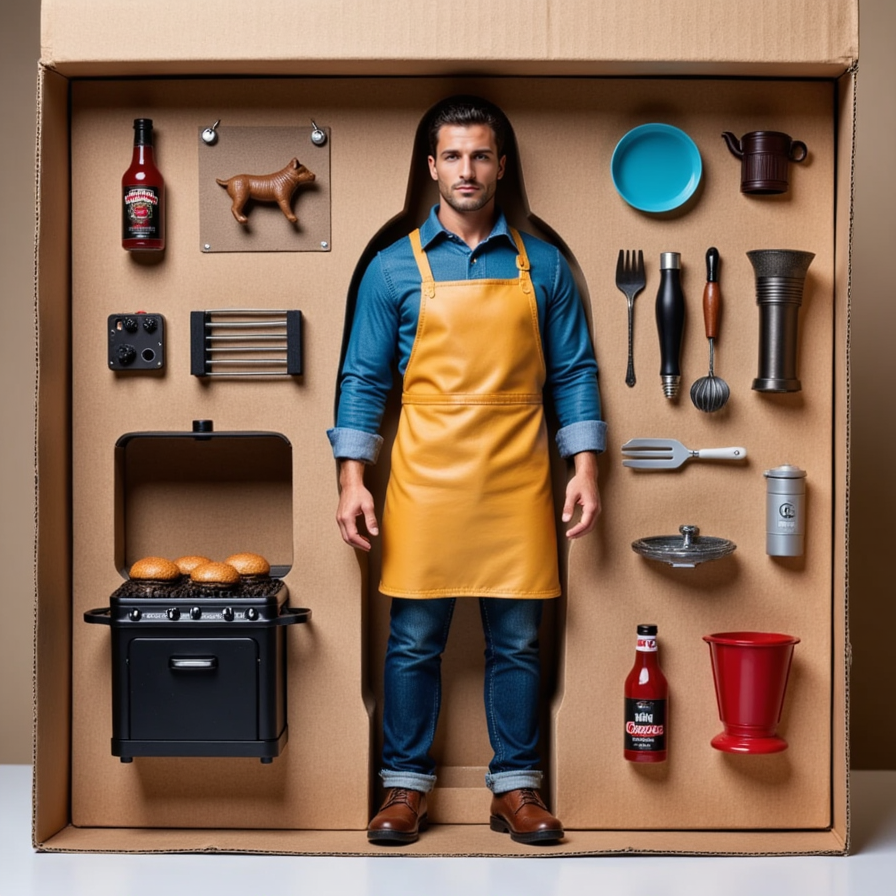 In a dad hat and apron, this figure stands near a miniature grill, tongs in hand. Accessories include: burgers, BBQ sauce bottle, cooler, and picnic table.