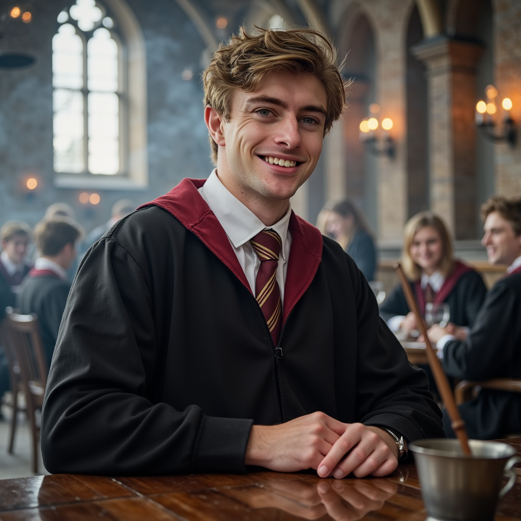 Ultra-detailed, highly realistic HDR medium portrait of a 17-year-old male Gryffindor student with fair skin, faint peach undertones, and defined jawline. Neat sandy-blonde hair side-parted with a slight wave, well-groomed eyebrows, and a calm, confident expression with a soft smile. Wearing a pristine black Hogwarts robe with crisp red-and-gold trim, tie perfectly centered over a pressed white cotton shirt. Pose: seated at the head of the long house table, upper body leaning slightly forward, hands resting loosely on the polished wood surface near a silver goblet. Camera: Canon EOS R3, 35mm f/2 prime, aperture f/2, camera positioned at slightly below eye level for subtle authority framing. Lighting: warm golden key light from floating candles overhead (3000K) creating gentle top shadows under brow and nose, secondary bounce from polished table casting upward fill to soften jaw shadows, faint rim light on shoulders from side torches; micro-shadows from goblet stem visible on table surface. Background: blurred depth showing warm glow of other Gryffindor students at the table, minimal visual clutter, strong symmetry in composition.