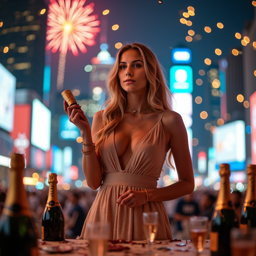 A woman stands confidently in the center of the frame, looking directly at the camera and laughing joyfully. She holds a party popper ready to burst as the countdown hits zero, her chic dress and glowing party backdrop embodying the celebratory vibe