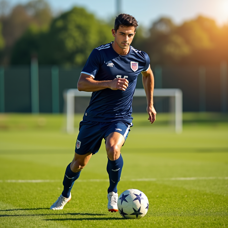 man in athletic wear, focused expression, expertly dribbling a football, poised in a dynamic stance on a lush green field under a clear blue sky.