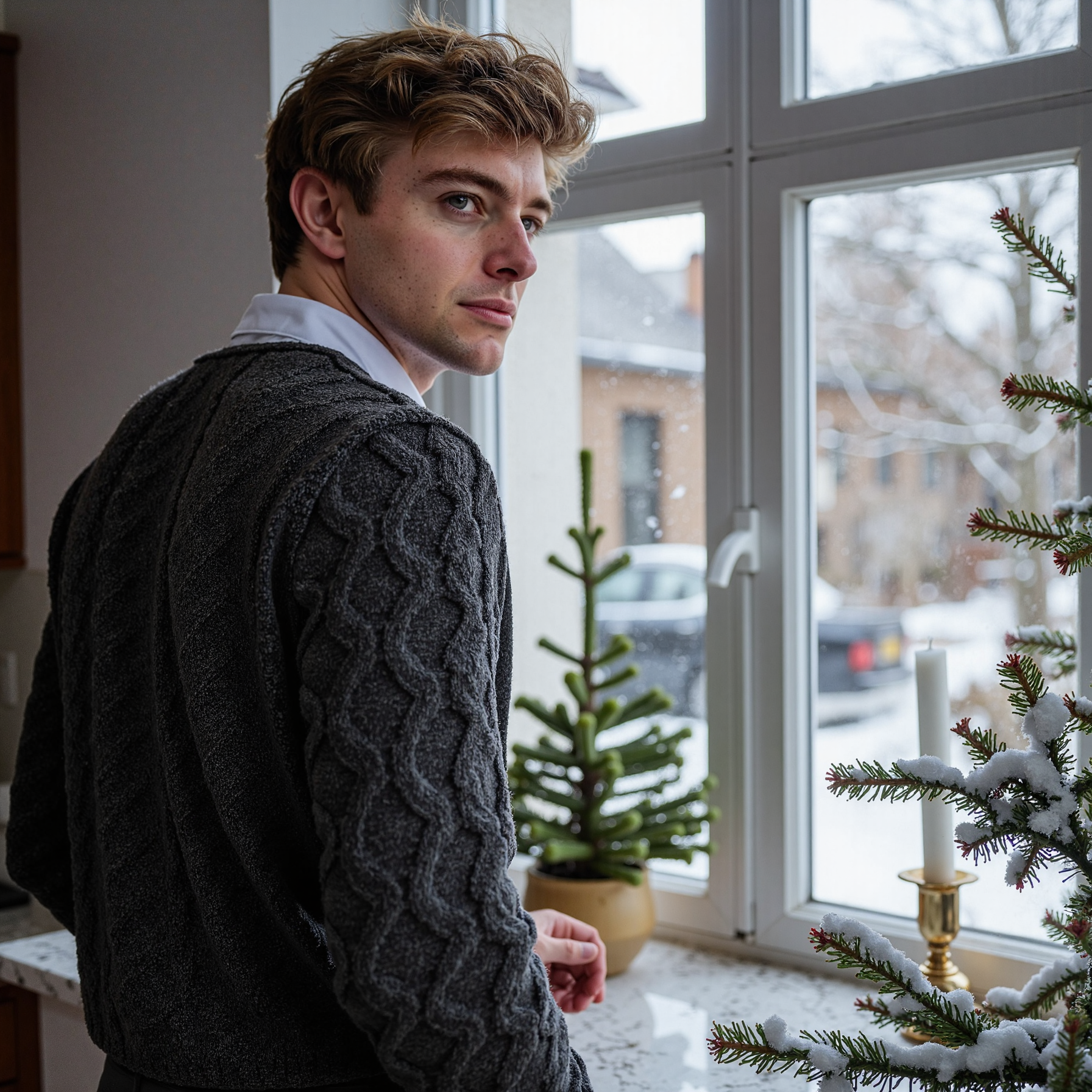 Waist-up portrait of a man standing at a frost-kissed bay window, turned 30° away from camera and gazing past the lens, off-center framing. He wears a charcoal wool cable-knit sweater layered over an oxford shirt with a slightly rumpled collar; fine wool fiber texture visible. Hair: short, side-part, lightly tousled; subtle weekend stubble. Lighting: cool north-light window key with a gold bounce fill from the right to add Christmas warmth; faint practical bokeh of a small tree in the background. Background: frosted glass with delicate condensation trails; minimal decor (a single brass candlestick out of focus). Camera: 50mm lens, f/2; highly realistic, highly detailed, HDR; crisp eye catchlights, sweater pattern sharply resolved; calm, still pose.