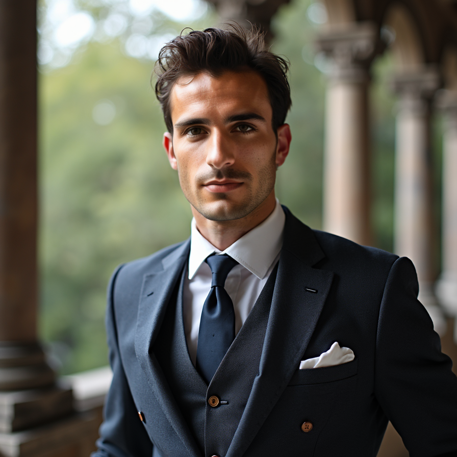 Man in suit, cinematic close-up, moody composition, professional.