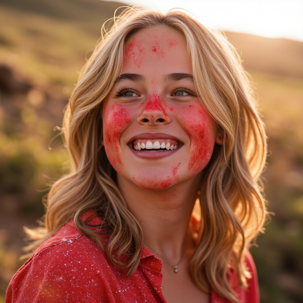 woman with a joyful, free-spirited expression, her face and clothing covered in bursts of tomato red. Her presence feels expressive and radiant, with sunlight adding warmth and clarity to every detail. The background is softly blurred, with hints of festive color in the air. Lighting is clean and natural, capturing glistening wet textures and rich saturation. Hyper-detailed, sharp focus, bold colors, lively emotion.