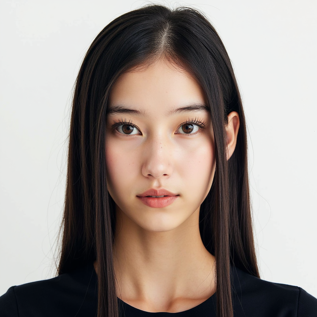 A highly detailed HDR passport-style portrait of a young woman in her mid-20s, captured in a close head-and-shoulders shot. She has long straight black hair, brushed neatly behind her shoulders with a center part. She wears a simple black round-neck top with matte fabric and no patterns. The background is bright pure white with absolutely no shadow. Lighting is soft frontal LED-style illumination to ensure full…