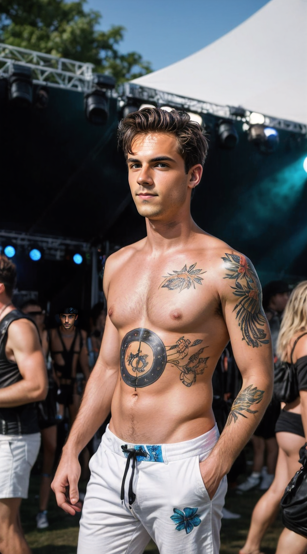 Bold, artistic man, body art, expressive festival spirit.