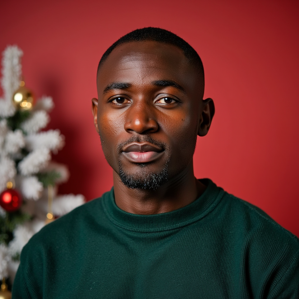 Headshot of a man in a modern photo studio with a matte red backdrop providing a bold Christmas theme. He faces the camera straight-on, expression confident but soft. He wears a dark forest-green cashmere crewneck, ribbed collar visible in detail. Hair: short fade with neatly styled top; light stubble. Lighting: classic studio beauty lighting — large softbox frontal key plus gentle kicker from camera-left; even skin…