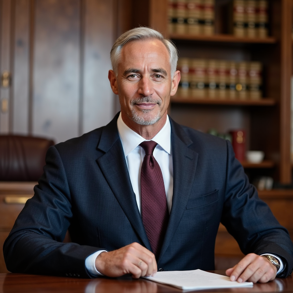 HDR medium portrait, 50 mm f/2.0, slightly low angle. Man in early 60s, fair skin with deep laugh lines, silver hair combed back neatly. Navy three-piece suit in fine worsted wool with faint herringbone texture, crisp white spread-collar shirt, dark burgundy silk tie with subtle diagonal ribbing. Standing at counsel table with one hand resting on an open legal pad. Lighting: warm tungsten from above with a soft fill…