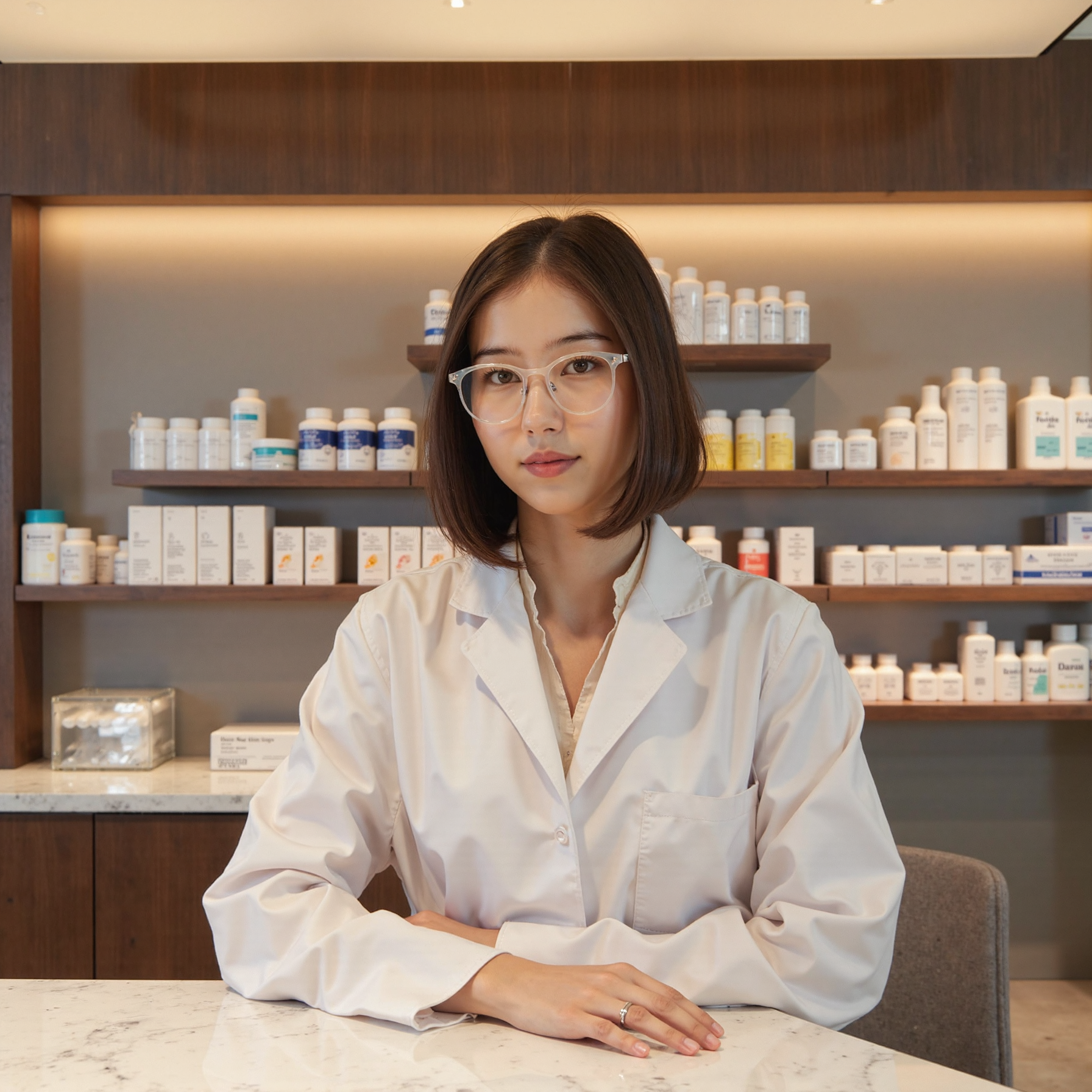 Highly detailed, highly realistic HDR portrait of a woman pharmacist behind a bright counter; crisp lab coat over pastel blouse, short straight bob, frameless glasses. Camera: 50mm lens, f/2.2, ISO 320, chest-up framing, direct eye-level. Lighting: daylight fill from counter front, key overhead panel creating soft highlights on shoulders; faint shadow on wall behind. Pose: hands resting lightly on counter, calm…