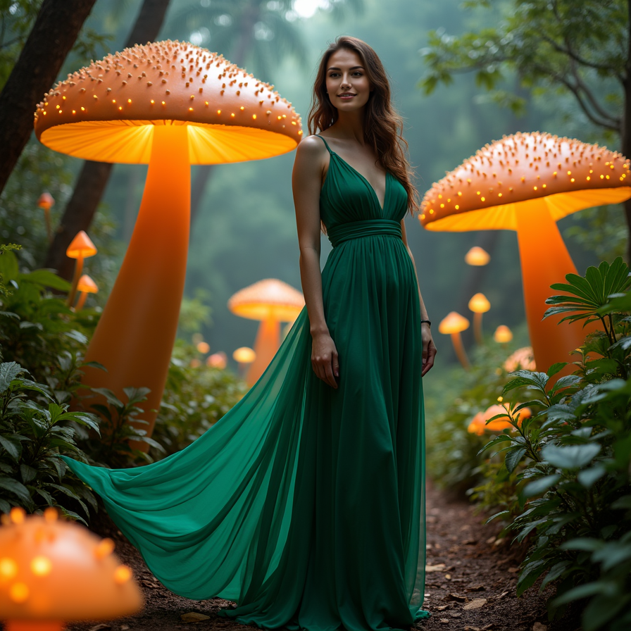 A woman in a flowing emerald dress, standing among giant, luminous mushrooms and mystical plants. Soft lights glow around her, blending with the deep greens of an enchanted forest.