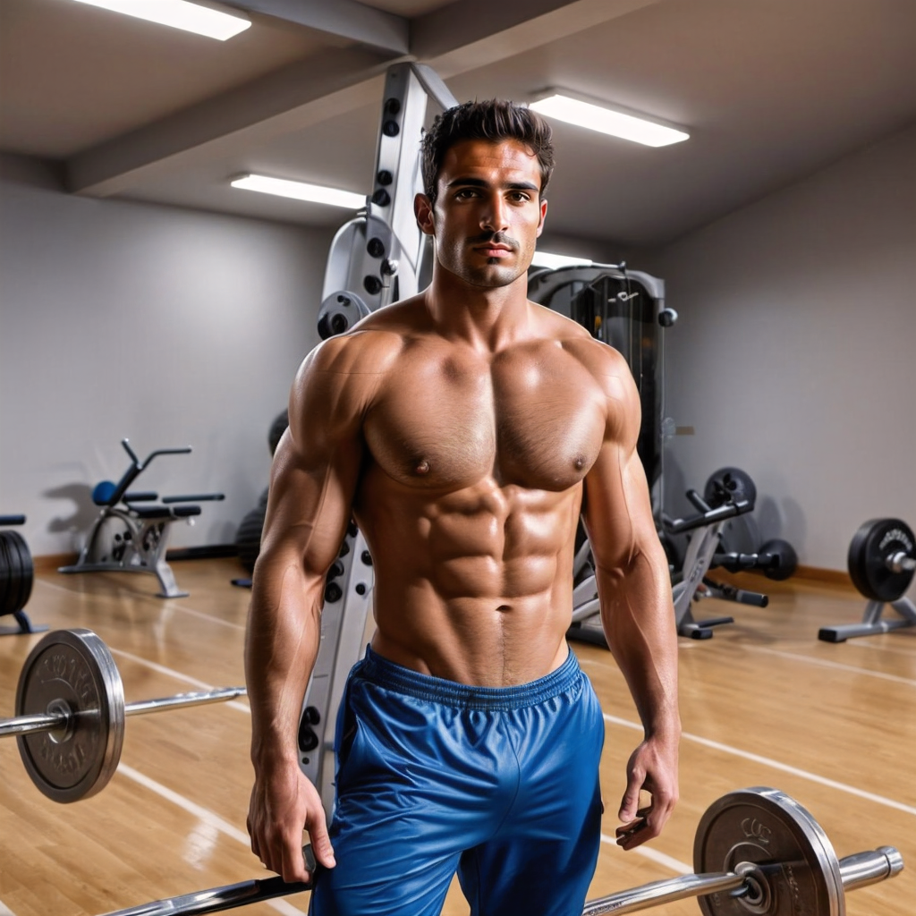 Muscular man, gym setting, confident pose, athletic, natural lighting.