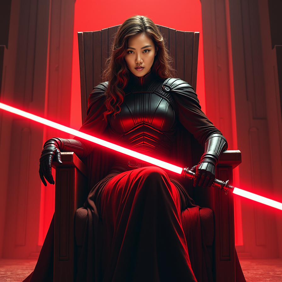 A powerful female Sith sits on a throne, facing the camera with a fierce and intense gaze. The shadows around her are illuminated by her red lightsaber, which she holds across her lap. Her dark armor and the ominous, red-lit chamber create an intimidating atmosphere.