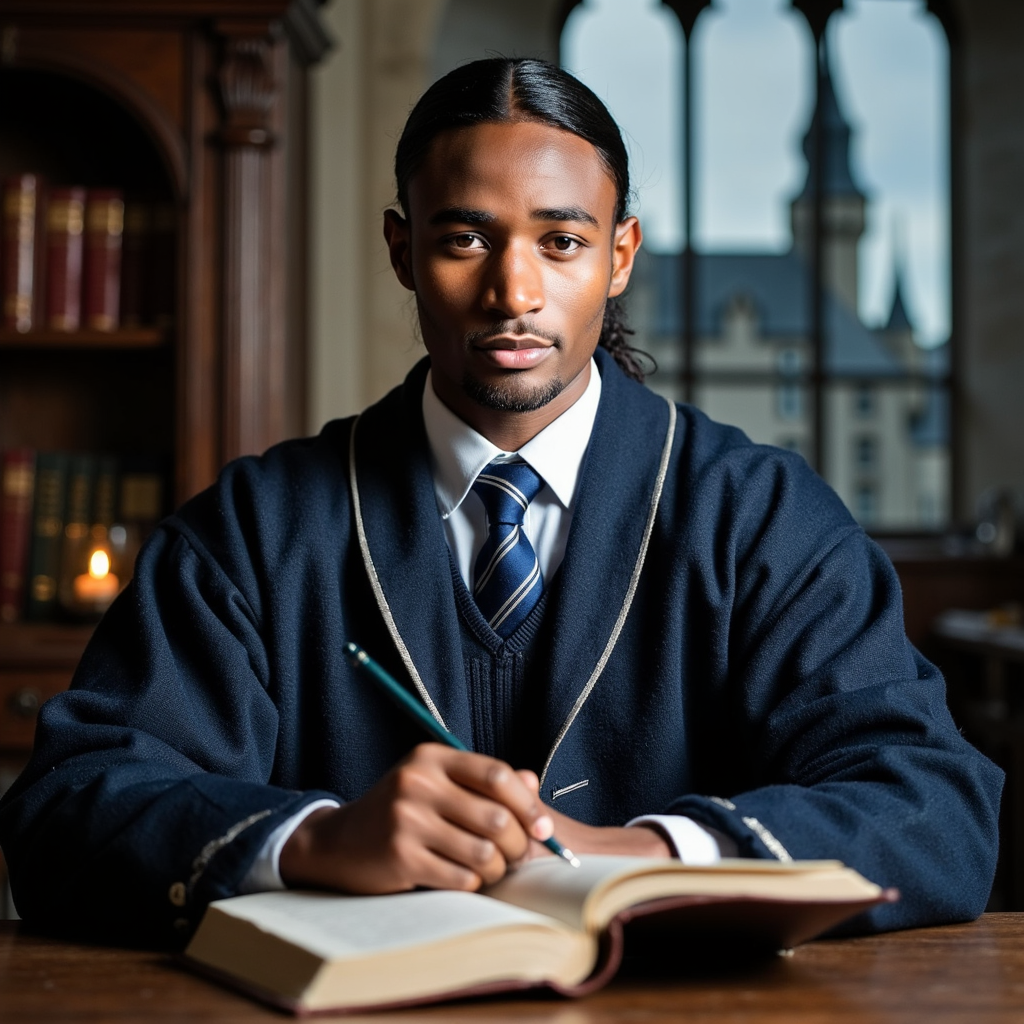 Ultra-detailed HDR seated portrait of a 17-year-old male Hogwarts student with light olive skin, clean-shaven face, and sharp cheekbones. Sleek dark hair pulled back into a short ponytail, neat sideburns framing ears. Wearing a deep-navy wool robe with silver-blue trim, crisp white cotton shirt, and perfectly knotted blue-striped tie. Pose: seated upright at a carved oak desk, left hand resting on an open…