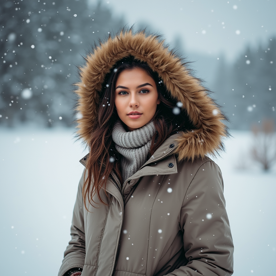 woman in warm winter coat and snow boots, surrounded by snowflakes, against a serene winter wonderland backdrop, with snow-covered trees and a frozen lake in the distance, capturing the magic of winter
