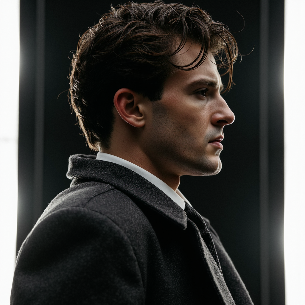 A cinematic dramatic portrait of a man (late 30s) with a controlled “spy film” vibe, waist-up, strong profile-to-three-quarter angle, camera at shoulder height with a slight tilt for tension. Hair: slicked-back dark hair with a clean side part, a few imperfect strands. Face: realistic skin texture, faint forehead lines, subtle scar near eyebrow, sharp jawline with light stubble, expression restrained and suspicious,…