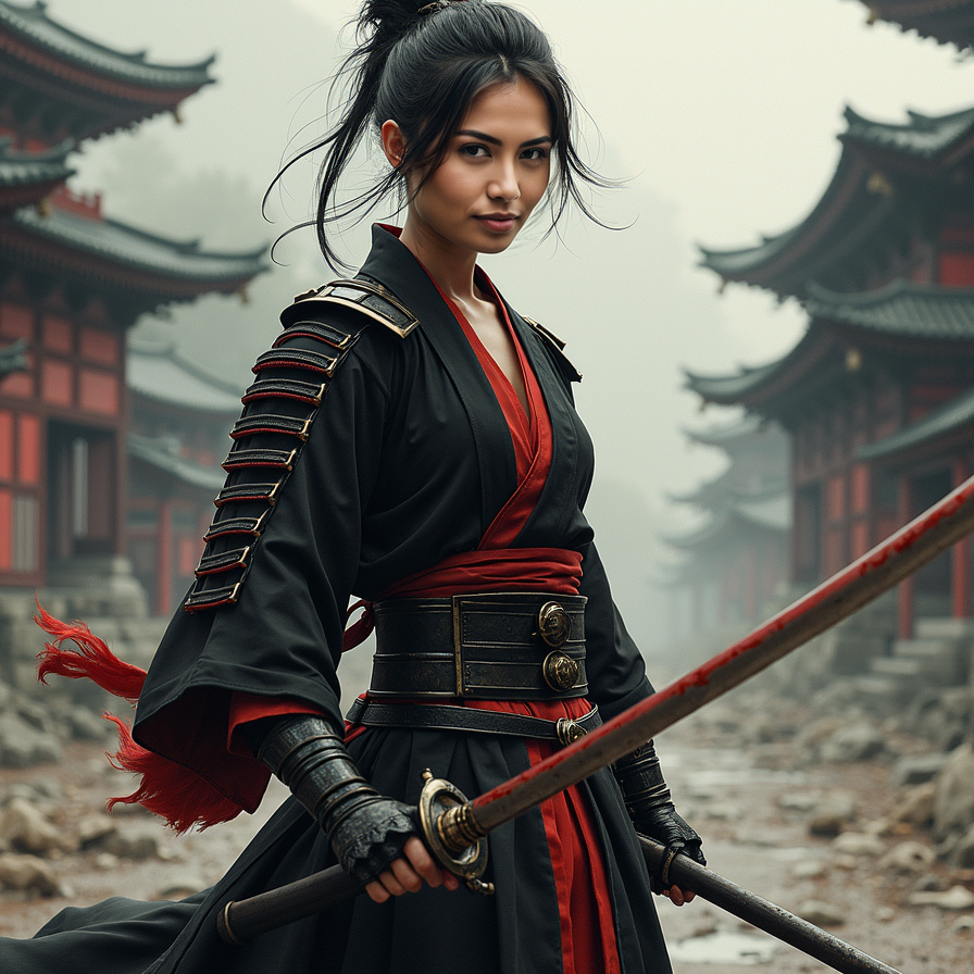 woman in traditional samurai attire, consisting of a hakama and kimono, with a bold, determined expression, sans helmet, posed in a powerful stance, surrounded by a misty, atmospheric background with subtle hints of Japanese architecture.