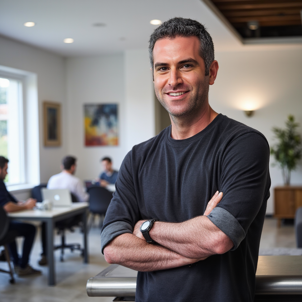 man in a charcoal grey crew-neck t-shirt with subtle texture, casually leaning against a sleek, metallic counter. He has a warm, approachable smile, his gaze directly engaging the viewer. The background features a softly blurred, modern co-working space with distant figures at laptops and abstract art on the walls, illuminated by the gentle glow of natural light filtering through large windows.