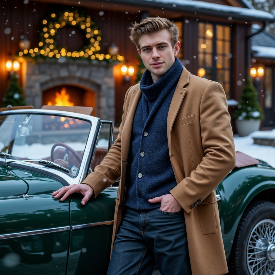 Man leaning against a deep-green vintage convertible parked near a pine-lined driveway, subtle snowfall. Hairstyle: slicked back with matte finish, short beard trimmed. Attire: camel wool coat, navy cashmere scarf, leather driving gloves. Fabric details: crisp wool texture, fine cashmere fibers, glove patina. Camera: slightly low angle, 35mm, f/2.0 for cinematic perspective. Lighting: cool blue dusk ambient + warm…