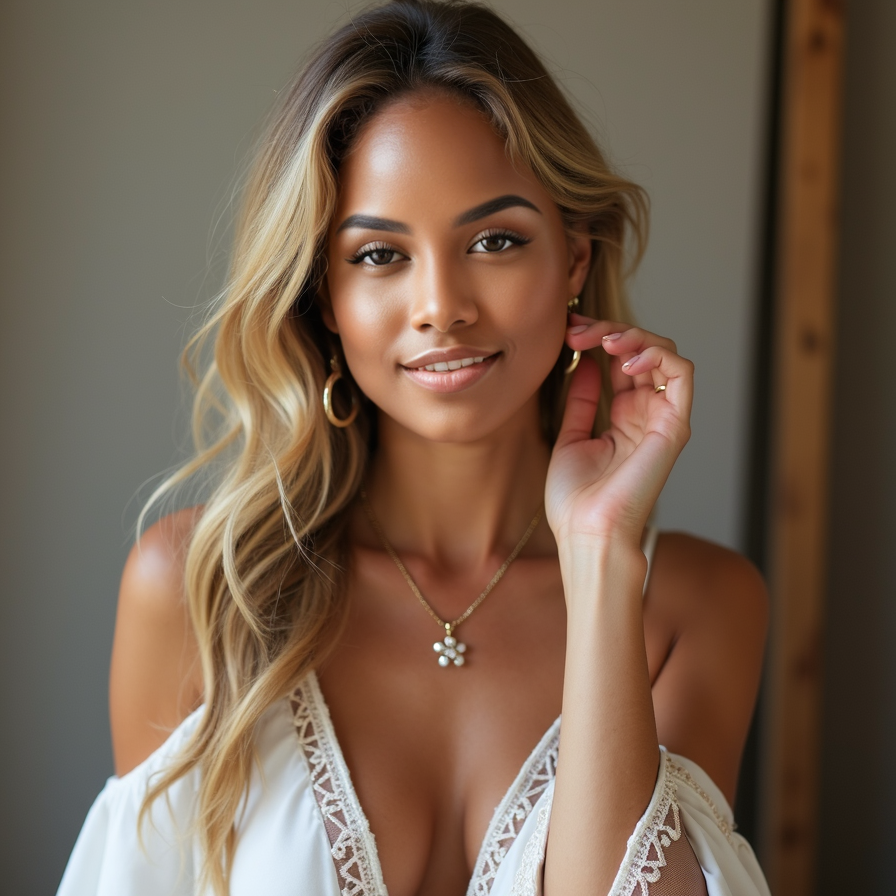 woman designed for a high-impact dating profile. She is styled in elegant yet casual attire, with subtle jewelry adding a touch of sophistication. The backdrop is neutral or softly blurred, with lighting that accentuates her features, creating a captivating image