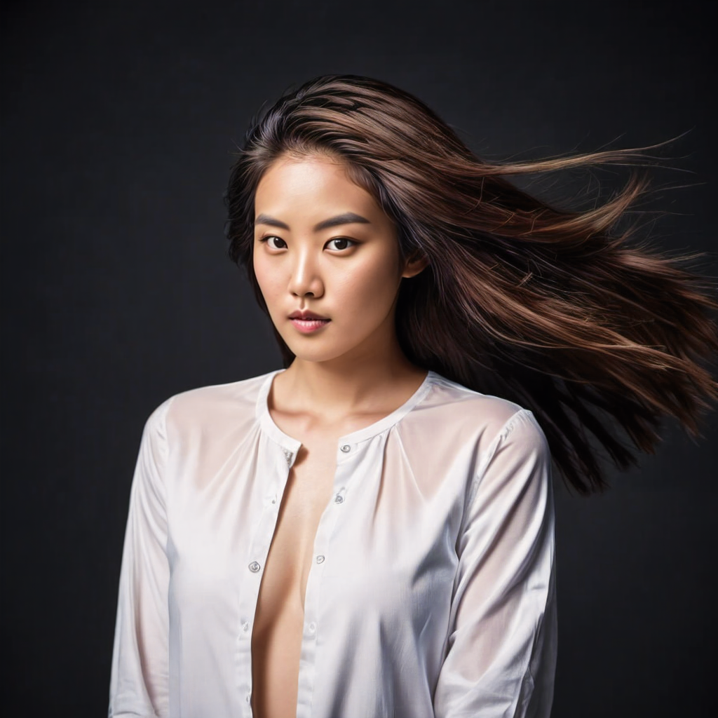 Woman in evening gown, dramatic lighting, sunset cityscape backdrop.