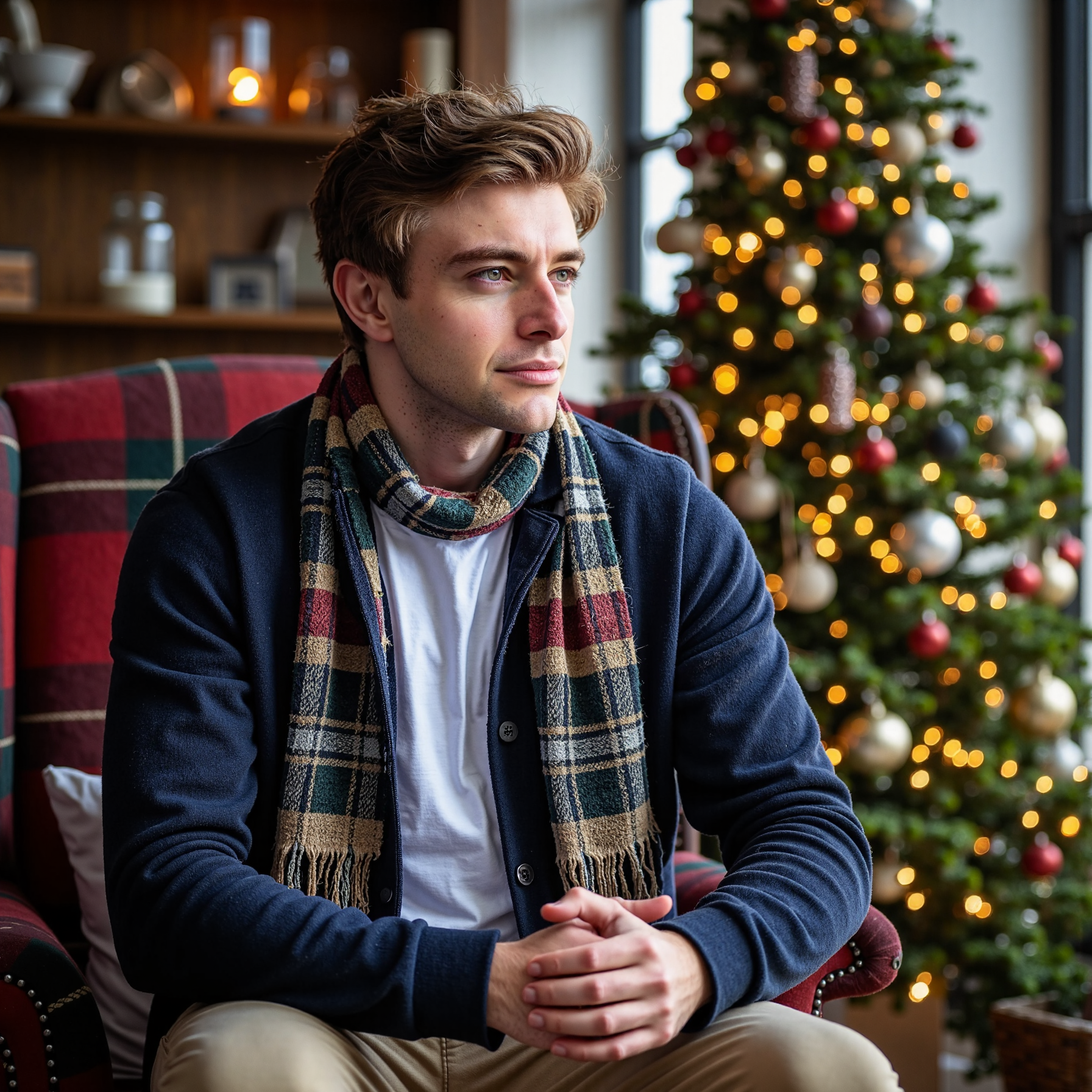 Waist-up side-profile portrait of a man seated on an armchair near a tastefully decorated Christmas tree; he looks slightly past camera, posture relaxed, hands resting together. Wardrobe: navy merino cardigan with horn buttons over a white tee; textured tweed scarf draped loosely (visible herringbone). Hair: medium length, brushed back; neatly trimmed beard. Lighting: practical fairy-light key from the tree plus a…