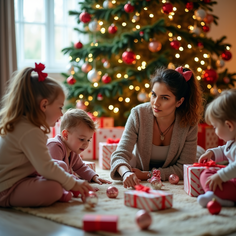 "A bright, cheerful scene with children excitedly playing on the floor, new toys scattered around them. Include glimpses of festive wrapping paper, a nearby Christmas tree, and proud family members smiling in the background."