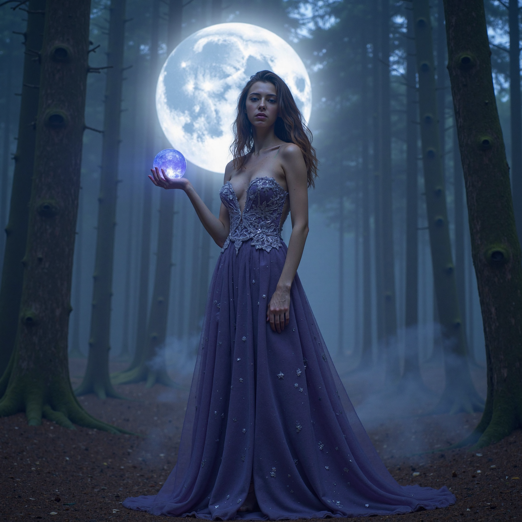 Create an ethereal cinematic portrait of me standing beneath a glowing moon in a misty forest. My gown is deep violet with shimmering silver embroidery that resembles constellations. My long hair flows in soft waves, and faint stardust particles swirl around me. I hold a crystal orb glowing faint blue, casting light onto my face. The background shows faint stars and drifting fog, with gentle rim lighting outlining my…