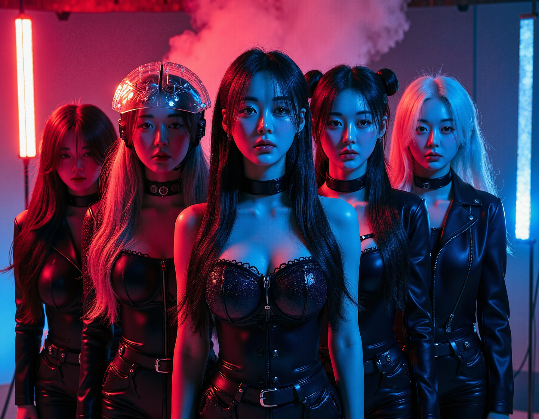 lineup of 5 hyper-realistic AI halloween portraits, each distinct — (1) cosmic witch wearing iridescent space veil, (2) haunted astronaut in cracked helmet under red nebula glow, (3) digital reaper cloaked in glitching pixels, (4) neon vampire with ultraviolet hair, (5) dreamcore doll in porcelain skin with cracked texture — cohesive moody lighting, cinematic HDR detail