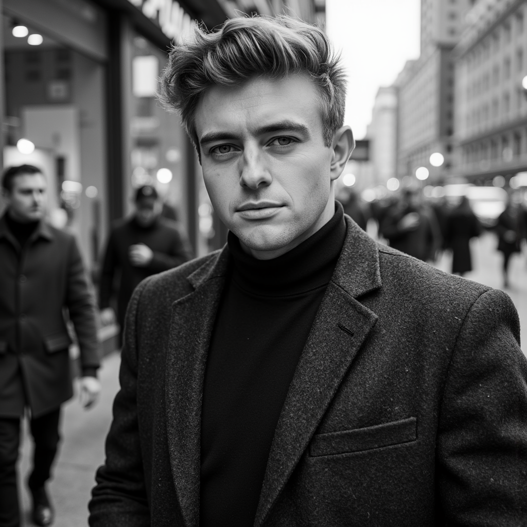 A man (male) close headshot in monochrome grayscale, evoking luxury fashion campaign tones. Hairstyle: precise fade cut; grooming: clean-shaven jawline. Attire: black turtleneck sweater under a structured wool overcoat, both highly textured under soft light. Pose: chin slightly up, direct gaze to lens; calm and stoic. Camera: 100mm macro portrait, f/2. Lighting: single diffused top-left key creating controlled shadow…