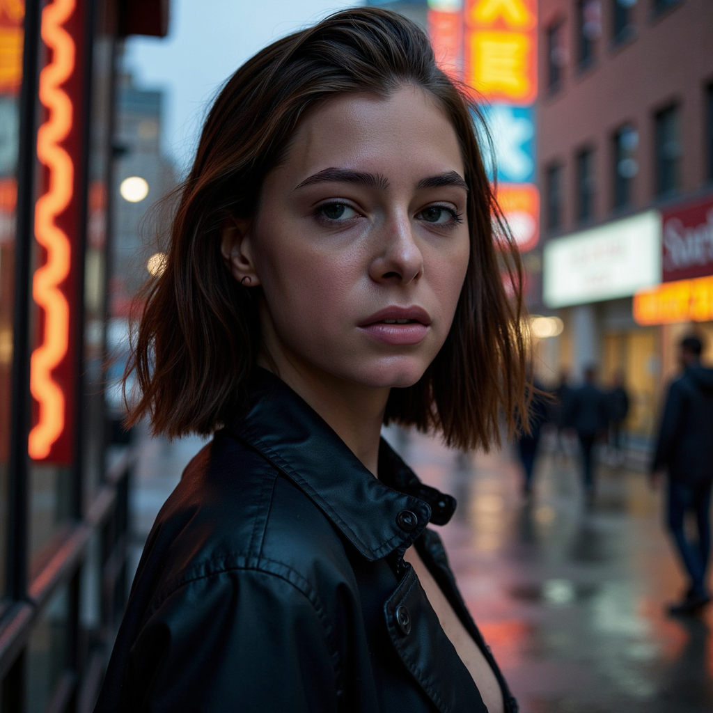 A cinematic neo-noir portrait of a woman (late 20s) standing under light rain at night, tight head-and-shoulders close-up, camera slightly below eye level for subtle power. She has wet, wavy shoulder-length hair with a few strands stuck to her cheek, natural skin texture with visible pores, faint under-eye texture, and a calm, intense gaze looking just past the lens. Wardrobe: black leather trench coat with realistic…