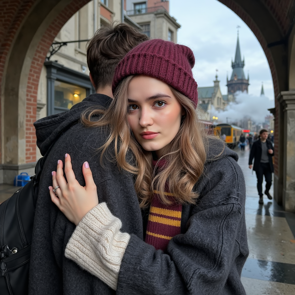 Highly realistic HDR medium shot of a 16-year-old female Hogwarts student with fair skin, rosy cheeks from the cold, and a soft closed-eyed smile as she hugs her parent tightly. Light blonde hair peeks from a maroon rib-knit beanie, edges softly curled and slightly frizzed from steam moisture. Wearing a deep charcoal wool Hogwarts robe over a cream thick-knit wool sweater, maroon-and-gold scarf wrapped snugly. Pose:…