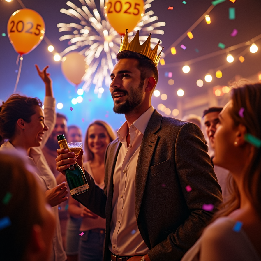A man surrounded by friends, wearing a paper crown and laughing, holding a drink and looking directly into the camera amidst a lively house party decorated with streamers and balloons reading “2025.