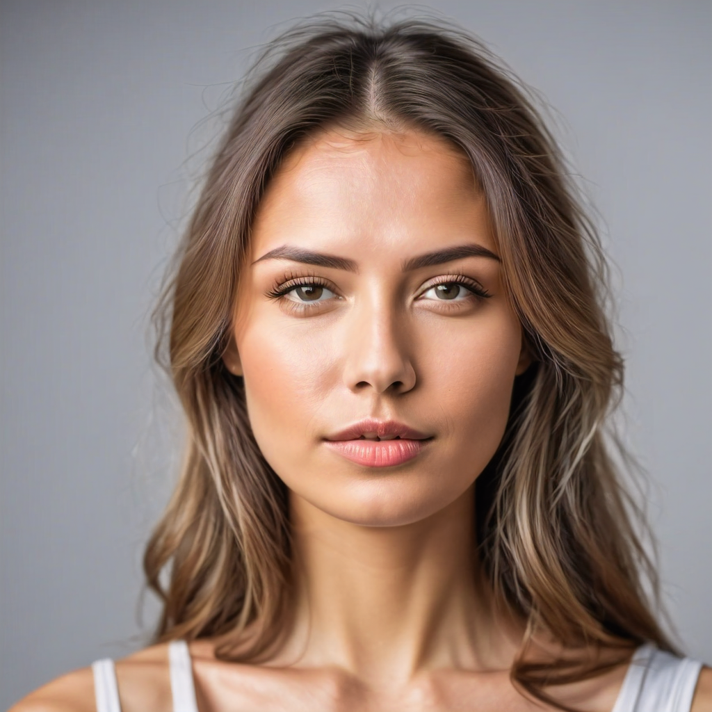 Woman in evening gown, dramatic lighting, sunset cityscape backdrop.