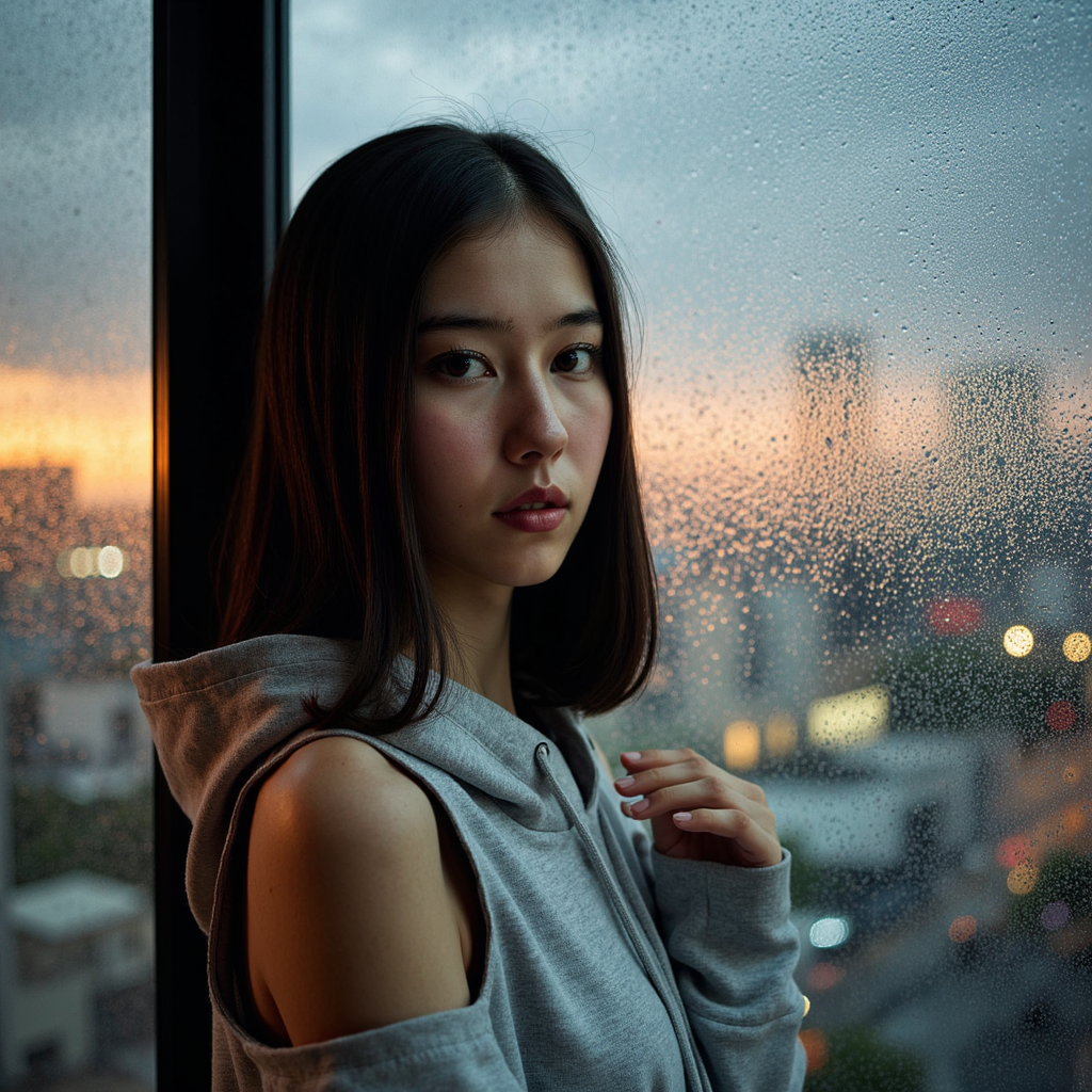 A cinematic emotional portrait of a woman (mid 20s) standing behind a rain-streaked window, tight headshot, camera directly facing her at eye level. Hair: straight shoulder-length hair, tucked behind one ear, slightly frizzy at edges. Face: realistic skin texture, faint acne marks, soft under-eye shadows, lips gently pressed, eyes locked onto camera with reflective sadness. Wardrobe: light gray cotton hoodie, soft…