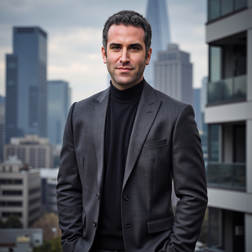 man wearing a charcoal gray turtleneck sweater, with his chin slightly raised, exhibiting elegant and deliberate posture. The studio's soft, directional lighting sculpts his features, casting subtle shadows that highlight the contours of his face. The backdrop is a seamless, deep slate grey, providing a minimalist and sophisticated frame for the portrait.