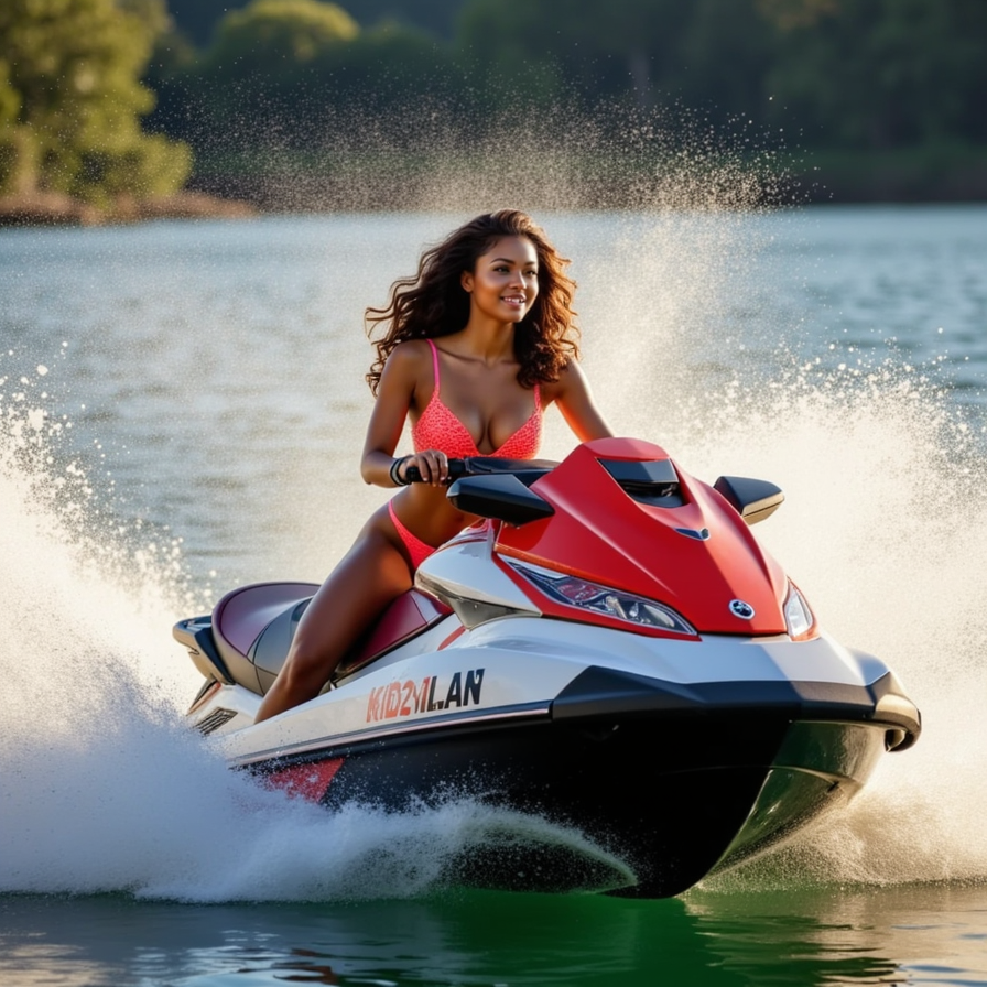 A woman in a neon bikini riding a jet ski at full speed, water spraying everywhere, with a high-energy, summer-party vibe.