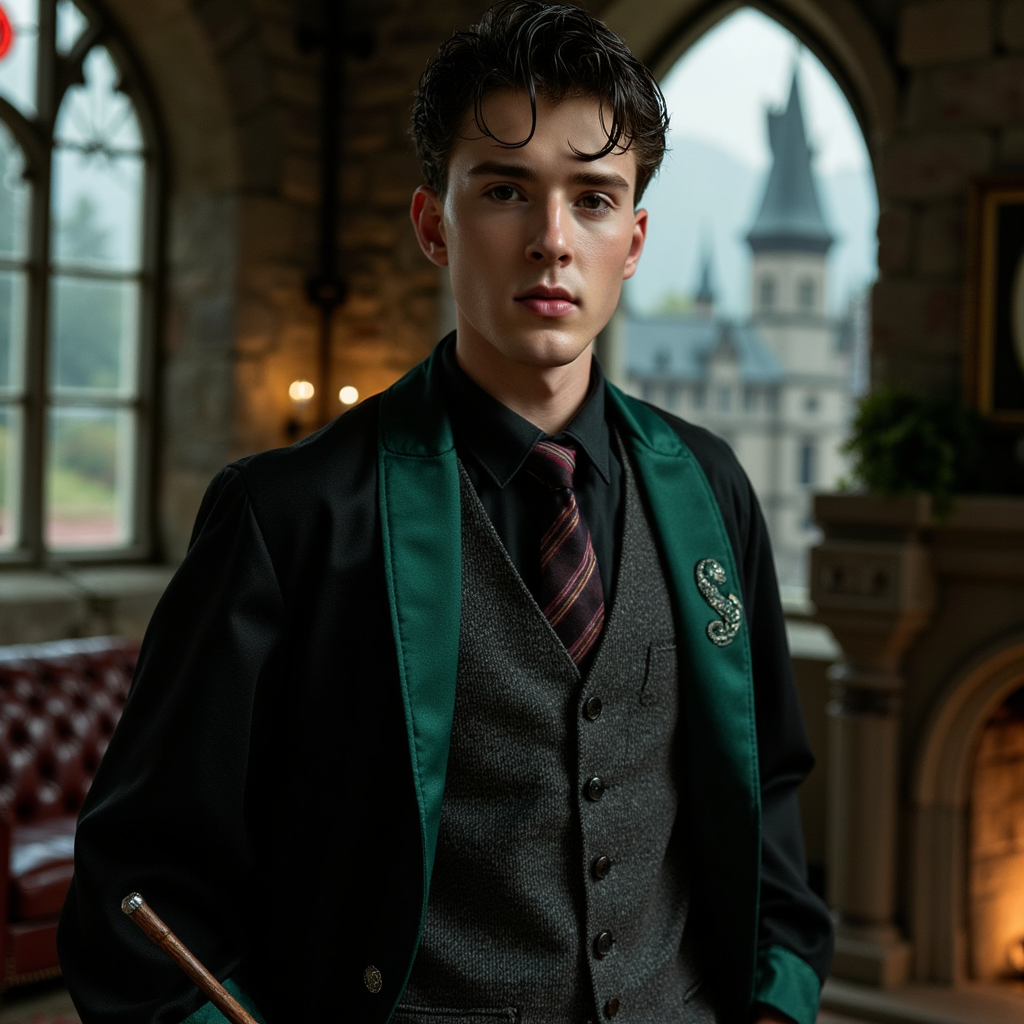 Three-quarter body shot of a teenage wizard with sharp jawline, slicked-back dark hair, pale skin tone with subtle pink undertones, wearing a deep emerald-lined robe with matte serpent embroidery barely catching the light. Under-robe: charcoal waistcoat with faint herringbone pattern, silver cufflinks glinting. Standing with one hand in pocket, chin tilted in quiet defiance. 50mm f/2.0, moody green ambient light from…
