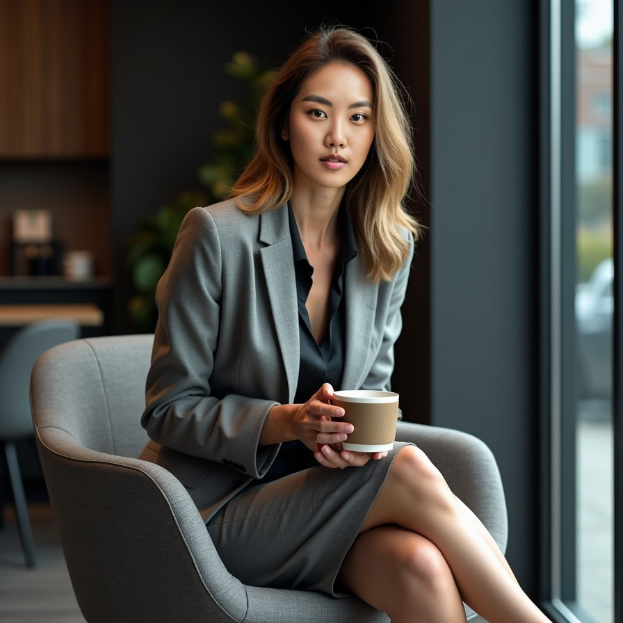 A professional woman sitting in a modern office lounge, wearing a smart casual outfit: a blazer over a silk blouse and fitted trousers. She holds a coffee cup in one hand, smiling warmly at the camera while crossing her legs elegantly