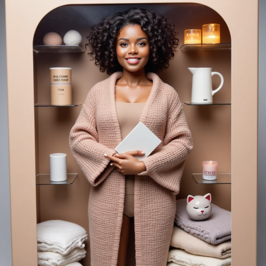 Wrapped in a chunky knit blanket, this figure holds a book in one hand and hot cocoa in the other. Includes: candles, fuzzy socks, sleepy cat figure, and fairy lights.