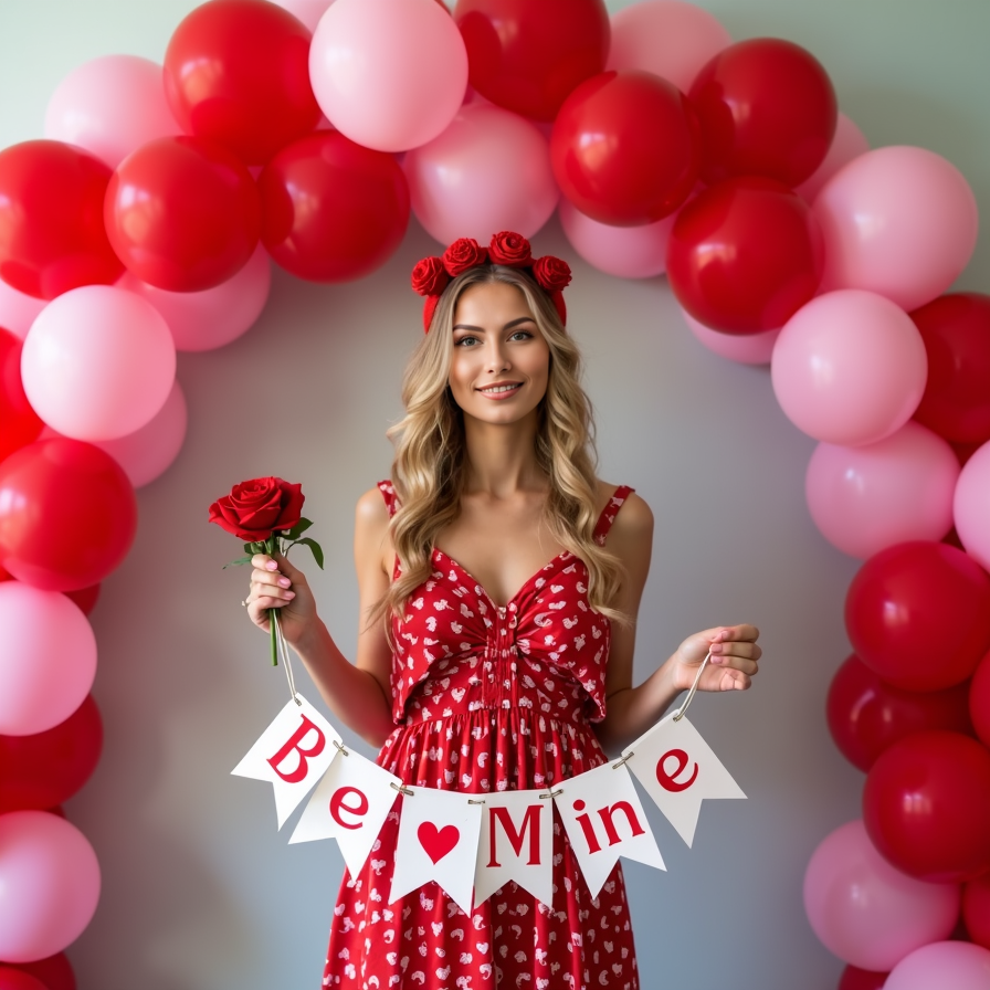 A model standing under an archway made of red and pink balloons, holding a "Be Mine" banner while wearing a heart-patterned dress and a matching headband.