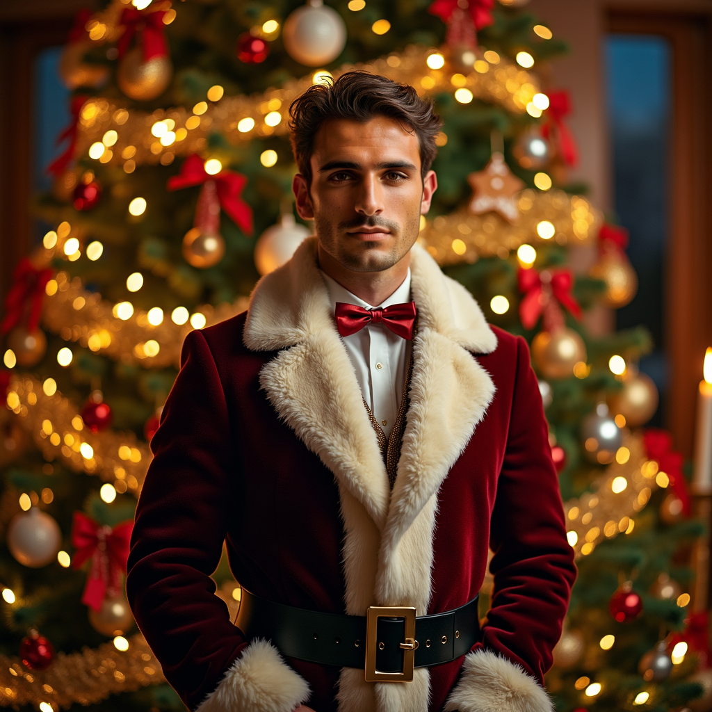 Man in festive vibe of Christmas AI, decorated christmas tree backdrop using AI Christmas Photo Generator.