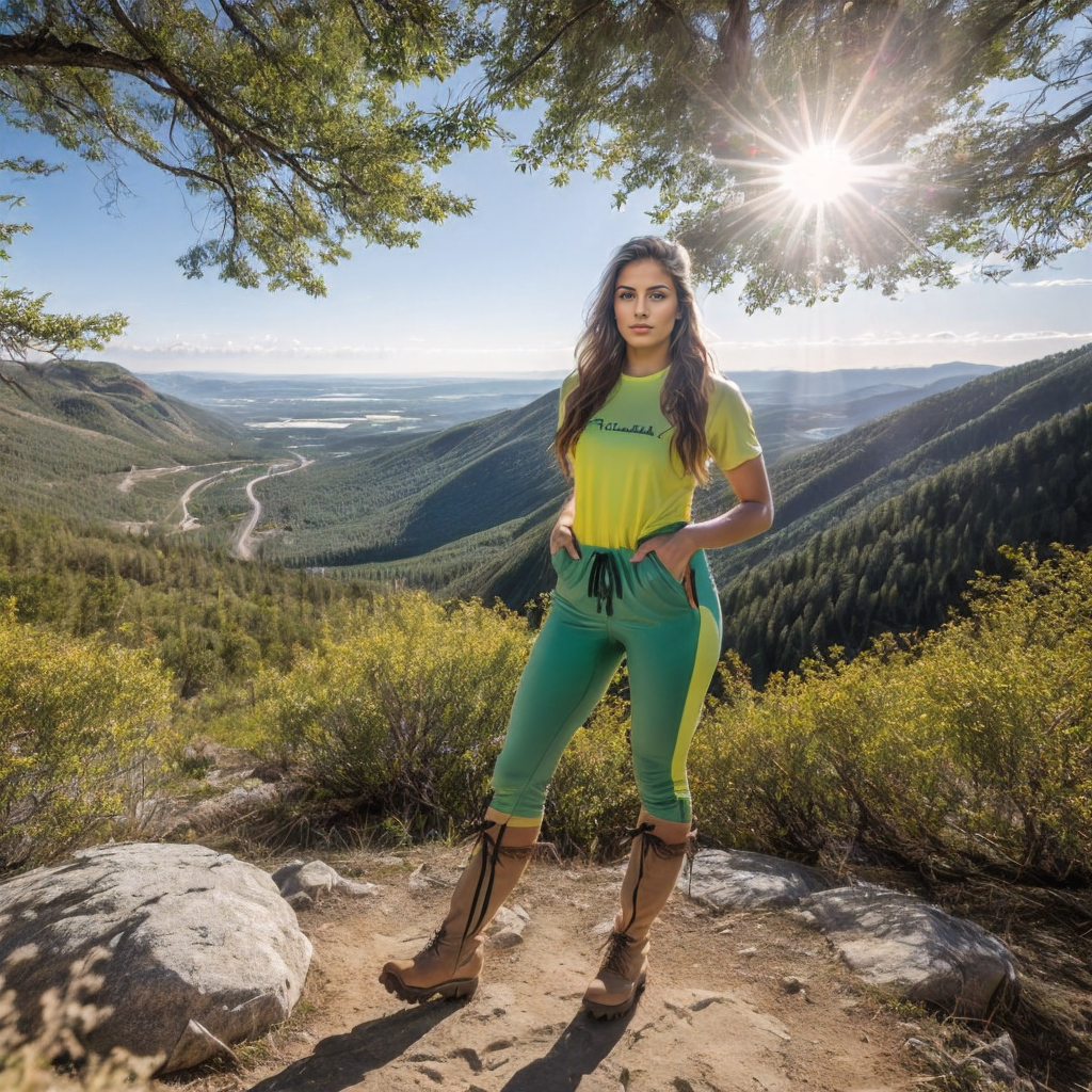 Determined woman on trek, snow-capped peaks, glowing light.