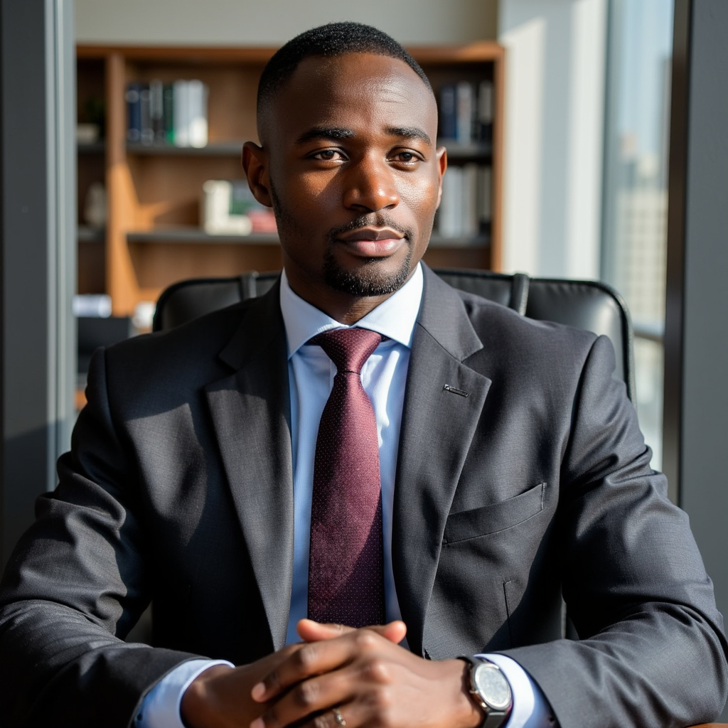 Three-quarter seated shot, 35 mm f/2.4. Man in late 40s, medium brown skin, short fade haircut with sharp edges. Charcoal slim-fit suit, light blue Oxford shirt, patterned navy tie. Leaning slightly forward with clasped hands. Lighting: daylight streaming through glass walls with slight rim on hair. Background: blurred skyline, clean glass surfaces, no paper clutter.