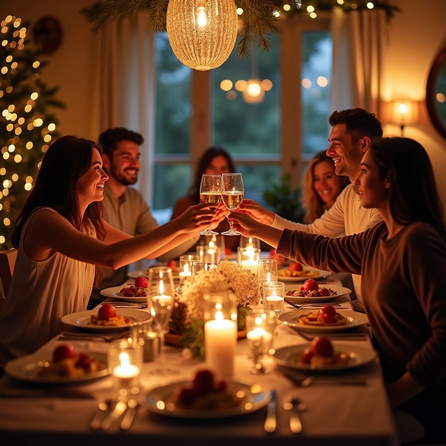 A warm, intimate family dinner scene on New Year’s Eve. The table is beautifully set with candles, festive dishes, and holiday decorations. Everyone is smiling and clinking glasses, with the golden light of the room adding to the cozy atmosphere. .