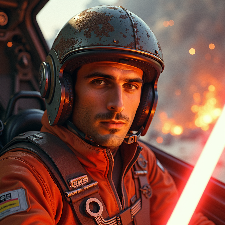 A male X-Wing pilot faces the camera from inside his cockpit, his helmet and flight suit showing battle wear. He has a determined look as explosions and blaster fire light up the scene, capturing the intensity of a high-stakes space battle.