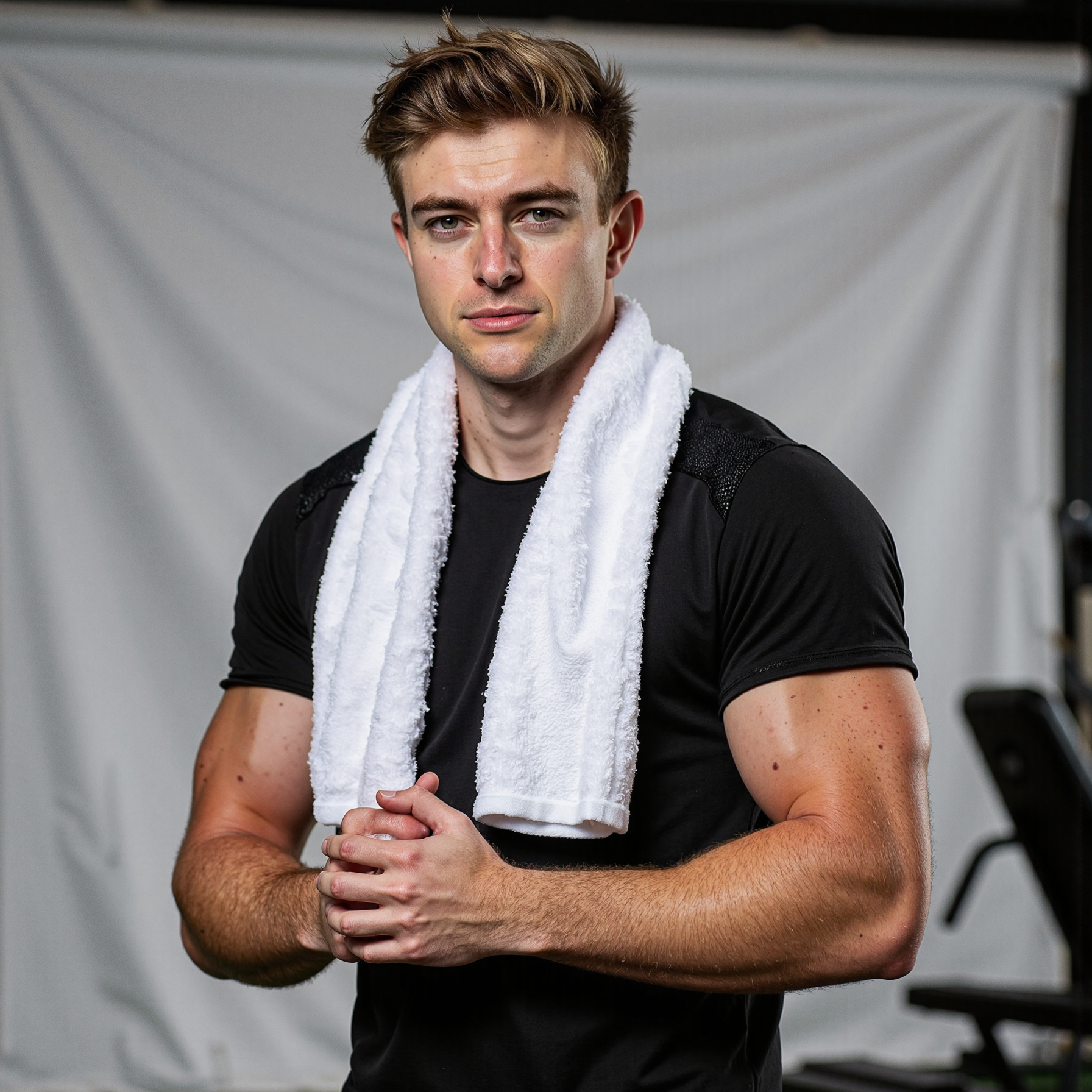 Man, athletic build, head-and-shoulders studio portrait with a towel draped around neck ends resting loosely on chest (hands relaxed down out of frame); neat short haircut, clean stubble, confident neutral expression; moisture-wicking black tee with fine micro-mesh paneling; high-key white seamless background; camera at eye level, 105mm, f/5.6, 1/160, ISO 100; clamshell lighting (large softbox above, reflector below)…